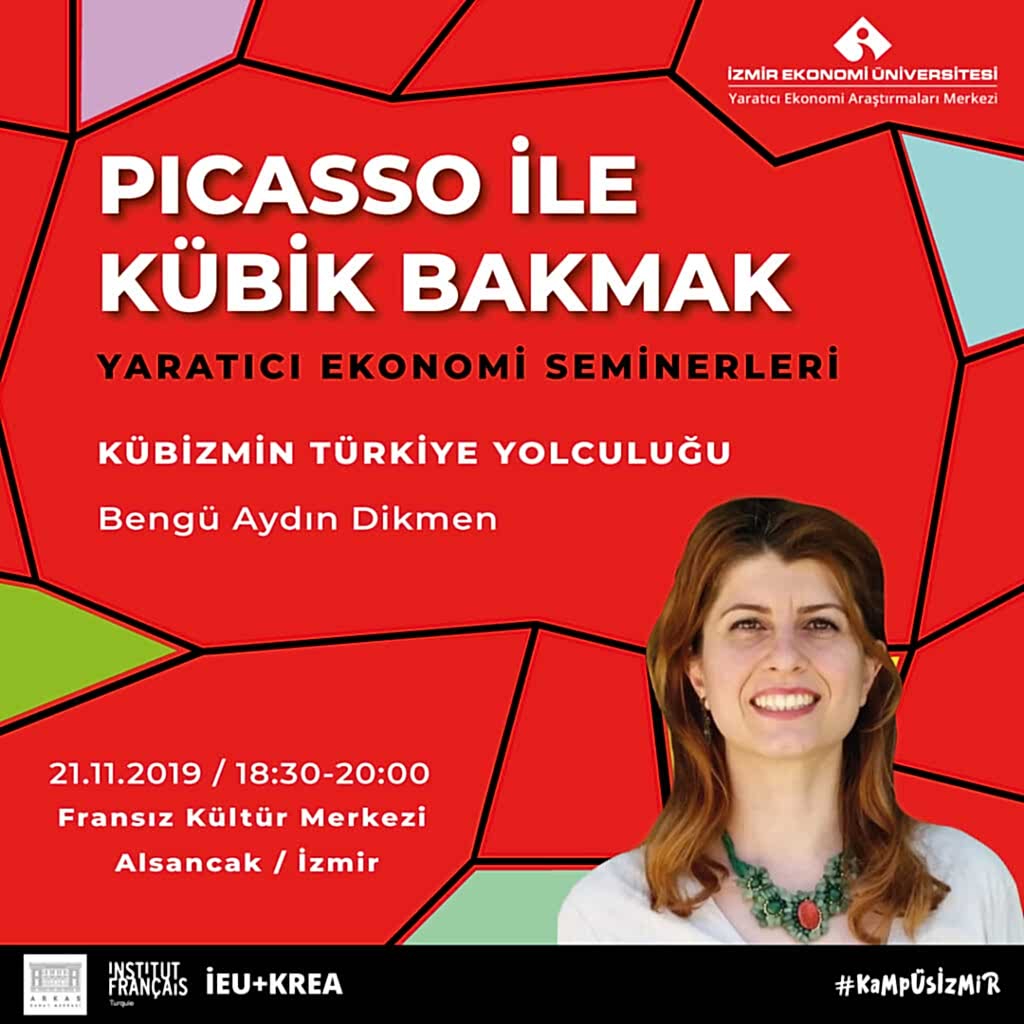 “Picasso: Gösteri Sanatı” sergisi kapsamında İzmir Ekonomi Üniversitesi Yaratıcı Ekonomi Araştırmaları Merkezi (İEÜ KREA) ve Arkas Sanat Merkezi’nin iş birliğiyle, 25 Ekim – 5 Aralık tarihleri arasında “Picasso ile Kübik Bakmak” temalı bir dizi etkinlik gerçekleştirildi. Katılımcıların, ünlü İspanyol ressam ve heykeltıraş Pablo Picasso’nun eserlerini sorgulayarak, yaratıcılıklarını geliştirmeleri amacıyla hazırlanan program kapsamında, alanında uzman kişilerin konuşmacı olarak yer aldığı seminerler ve atölye çalışmaları düzenlendi. Fransız Kültür Merkezi’nin ev sahipliğinde yapılan tüm seminerler, ücretsiz olarak herkesin katılımına açık olarak gerçekleştirildi.